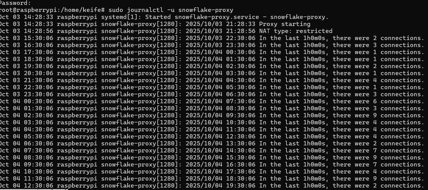Hi, So I am running a snowflake bridge, and here is the output after it running for a few days. Wondering, on my system, as there is no torrc configuration, is there a port that needs to be forwarded? How can I check if the bridge is reachable? Is the app from here: https://snowflake.torproject.org/ Thanks all. --Keifer
